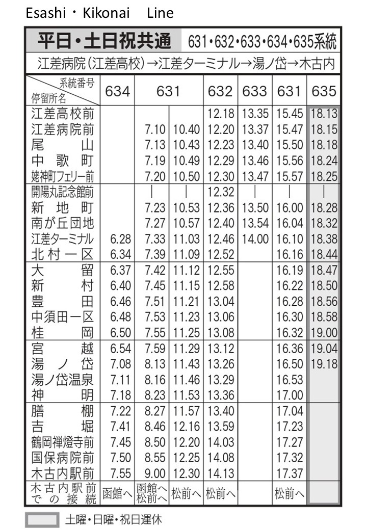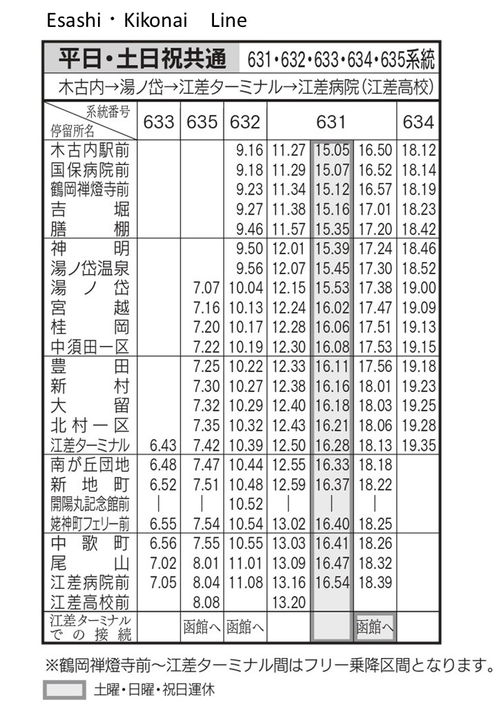 | Esashi Terminal | 06:28 | 07:33 | 11:03 | 12:46 | 14:00 | 16:10 | 18:38 |